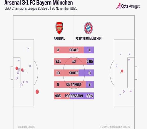 客战阿森纳时拜仁仅创造0.65个预期进球,为本赛季最低